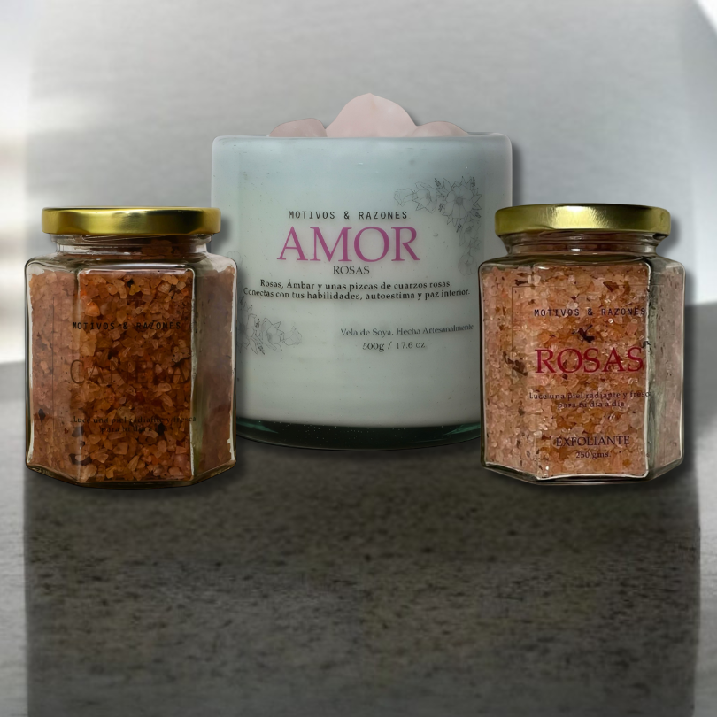 Un set pensado para regalar o consentirte. La combinación perfecta de bienestar y relajación: la vela artesanal llena el ambiente con una fragancia armonizante, las sales de baño ayudan a liberar el estrés, y el exfoliante de rosas deja la piel suave y revitalizada.