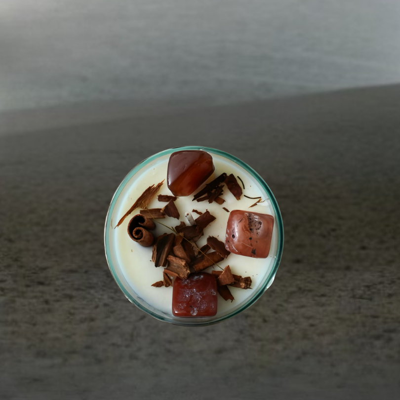 Con canela y cuarzo aventurina, esta vela de 250 g aleja energías negativas y atrae amor y abundancia.