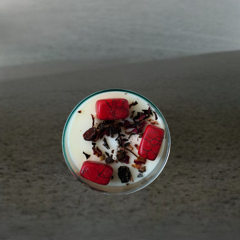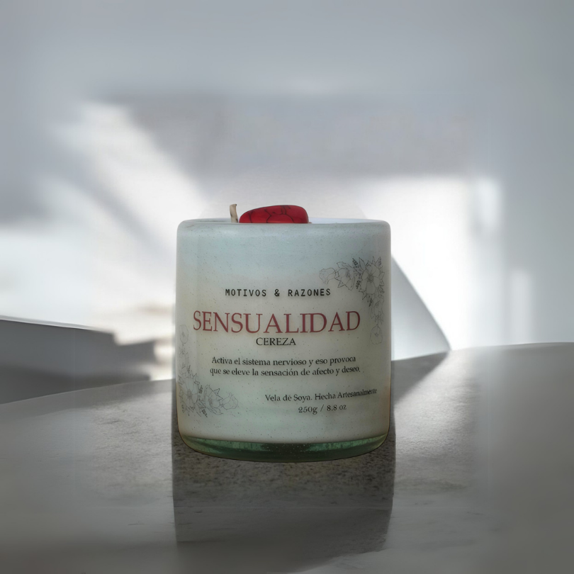 Esta vela artesanal de 250 g con aroma a cereza activa el sistema nervioso y eleva la sensación de afecto y deseo.
